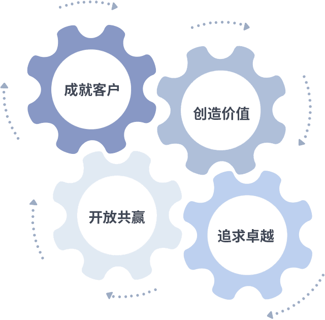 成就客户是一切决策的出发点,,,创造价值是衡量所有工作的标准,,,追求卓越是我们做事做人的态度,,,开放共赢是我们的格局也是最终的结果。。。价值观的齿轮环环相扣,,推动着组织里的每个人不断向前。。。。